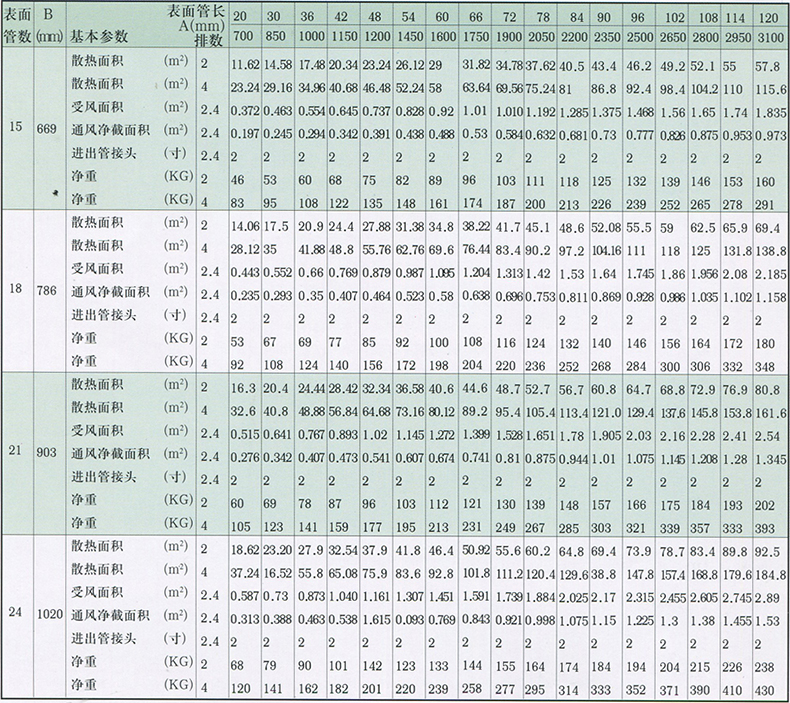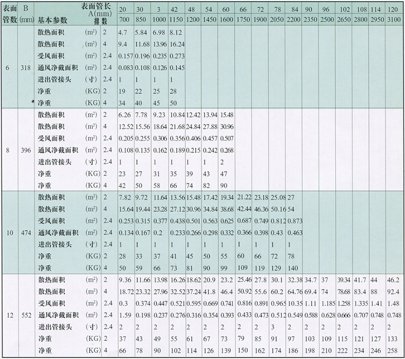 如采用四排,表面管數(shù)為10,管長為42英寸時(shí),則為GL-4-10-42。
